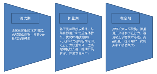 穩(wěn)定期:持續(xù)擴大人群規(guī)模,根據(jù)用戶興趣和瀏覽行為,運用動態(tài)創(chuàng)意技術(shù)等進(jìn)行商品匹配,提升用戶二次購買率和消費頻次。