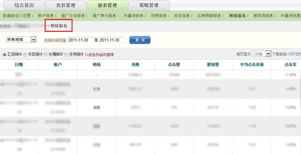 EMARBOX系統(tǒng)報表管理--地域報表模塊為聚美提供投放不同地域的消費、點擊、展現(xiàn)、cpc、點擊率、轉(zhuǎn)化率等數(shù)據(jù)指標(biāo), 便于推廣地區(qū)的慎重選擇,投資回報率的精細(xì)劃分。
