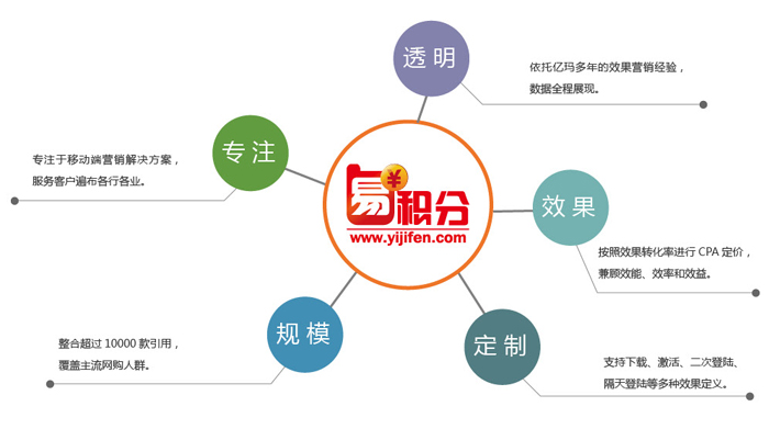 易積分是億瑪旗下移動(dòng)營(yíng)銷平臺(tái),也是國(guó)內(nèi)發(fā)展速度最快的移動(dòng)營(yíng)銷服務(wù)商。產(chǎn)品全面覆蓋安卓/iOS兩大平臺(tái),聚集過(guò)萬(wàn)開(kāi)發(fā)者,移動(dòng)流量日均超過(guò)3億,可提供應(yīng)用推薦、原生廣告、O2O廣告、富媒體廣告等多種廣告展現(xiàn)形式。易積分所服務(wù)的客戶分布廣泛,涵蓋了超過(guò)90%泛電商客戶,50%以上的手游客戶,80%以上的行業(yè)及品牌客戶等,為客戶提供專業(yè)的移動(dòng)營(yíng)銷解決方案。